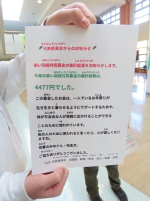 12/1 児童会代表委員会の呼びかけで行った赤い羽根共同募金。集金結果4,477円集まりました。ありがとうございました。