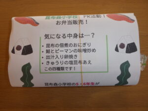12/10 高学年がロ・バザール様の協力でお弁当販売学習を行いました。目的は「昆布森の魅力を伝える」という総合的な学習の集大成として、昆布森の特産物を活かしたお弁当の販売学習に取り組みました。用意した50食は見事完売。これまで関わっていただきました全ての皆様に感謝申し上げます。