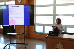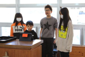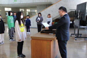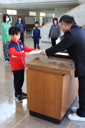 朝の全校朝会で、町内書き初め展、北海道信用漁業協同組合連合主催の『海の子作品展』で入選した2名の児童への表彰式を行いました。おめでとうございます。また、児童会の各委員会からも2月の取組の説明がありました。6年生にとっては、最後の児童会企画ではないでしょうか。