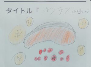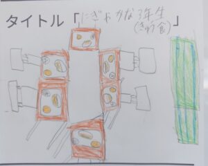 児童会文化委員会が企画した「おえかきコンクール」。テーマに沿って自由に絵を描く取組です。テーマは好きなもの、大好きなキャラクターだったり、好きな食べ物だったり…今年は先生方もみんな参加しました。たくさんの作品の中でも「すてきだな~」と感じたものを2作品紹介します。一つは、『おばあちゃんが作った料理(トキシラズの焼き魚・たくあん・梅干し)』なまらおいしいのでしょうね。もう一つは『にぎやかな3年生(給食)』友達とのおしゃべりしながらの給食時間が大好きなのでしょうね。