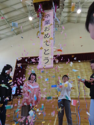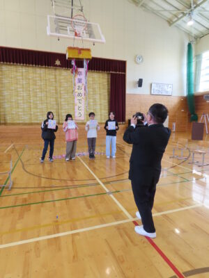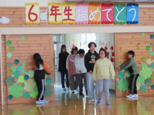 お別れの季節がやってきました。今日は「6年生を送る会」が開催されました。5年生3人が中心となり、各学級が役割を分担して準備をすすめてきました。”お世話になった6年生に感謝の気持ちを込めて!”みんな一生懸命用意してきました。楽しいゲームを考えてくれたのは5年生。対抗クイズ「うそを言っている人は誰?」。答えがバレバレ~うそのつけないかわいらしさが微笑ましかったです。ゴリラ鬼では、ちょうどよいタイミングで6年生が捕まってくれて、楽しく予定の時間内で2回もできました(さすがです)。低学年からは色紙のプレゼントとダンス!中学年からはお祝いの演奏とくす玉!6年生からのお礼の言葉はじ~んと心にしみました。とても心温まる会、この13人での学校生活も残すところ9日となりました。